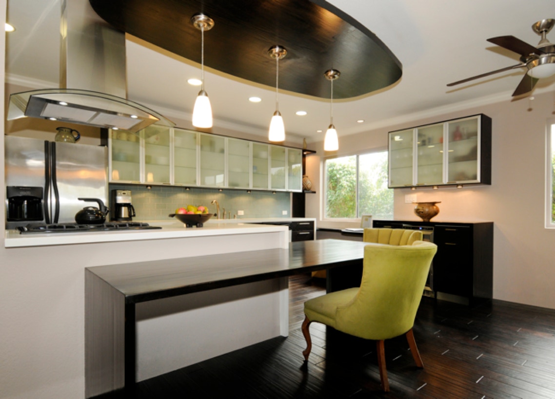 This sleek kitchen renovation was designed for a single person living near the beach who loved to entertain. The console near the window houses a wine refrigerator and storage for wine glasses and other bar items. To the left a small counter serves as the home office.