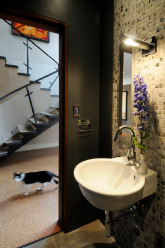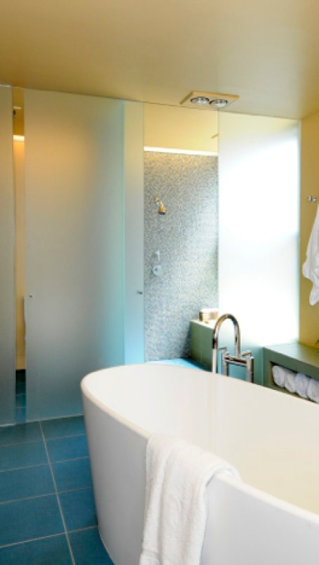 Translucent glass panels and recycled ocean-colored mosaic tile highlight luxe and restful baths.