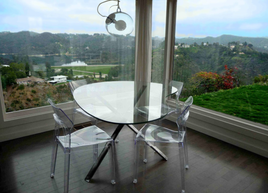 Maximizing on transparency in front of a stunning view in the Lake House breakfast room, this table has three brushed steel forms floating across each other, forming legs and tabletop structure.