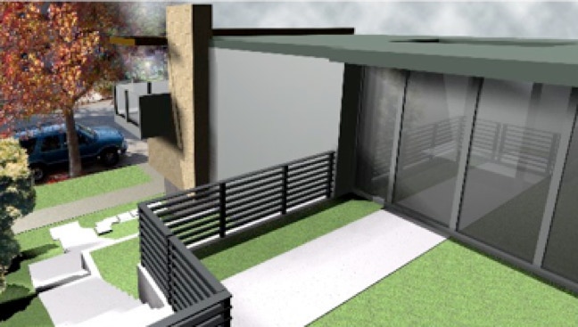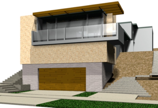 Featuring travertine exterior cladding, a cantilevered metal trellis and a frameless corner window, the home presents a welcoming façade at street level.
