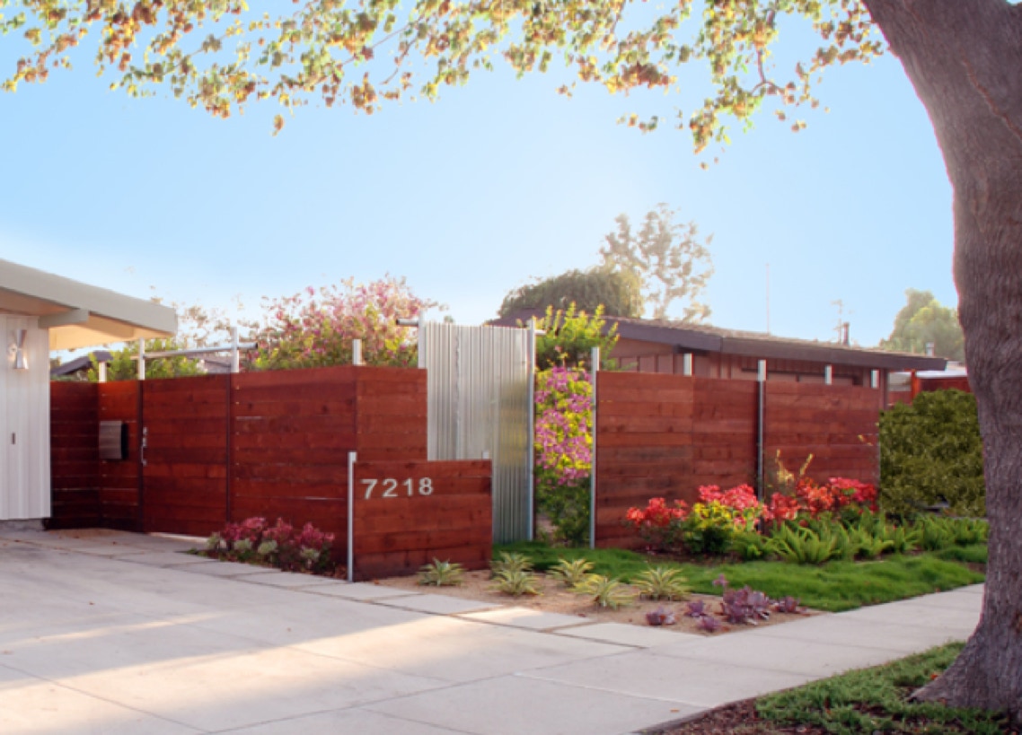 Stepped planes of the redwood & corrugated metal fence provide privacy without an imposing straight line barrier.