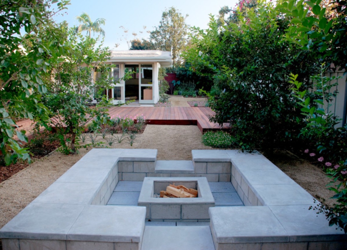 Where the blacktop driveway once was, a sunny new lounging area and a masonry fire pit are framed by a new arbor of flowering trees.