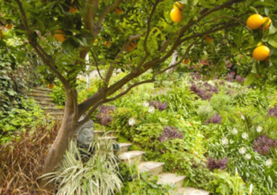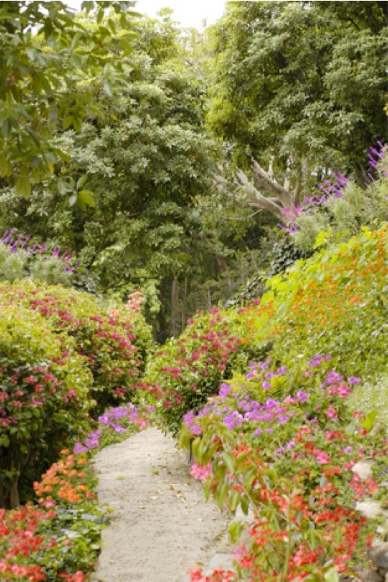 The vertical meadow on the canyon hillside beyond is densely planted with Monet-like sequential drifts of flowers. Paths meandering through a series of woodland vistas.