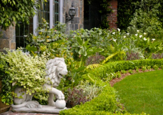 Beds of colorful roses & formal box hedges structure the entry court. The lawn transitions to a generous private patio with an orangerie, bluestone fountain pool & outdoor dining room.