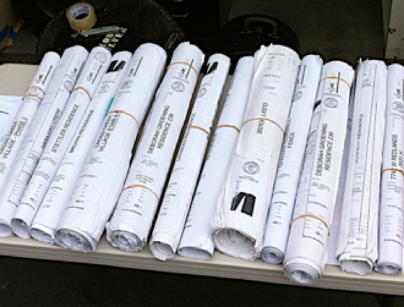 Rolls of used construction documents (plans). All cleared. If you need new, crisp documents, we can digitally reprint any of your choice. Call for more info.