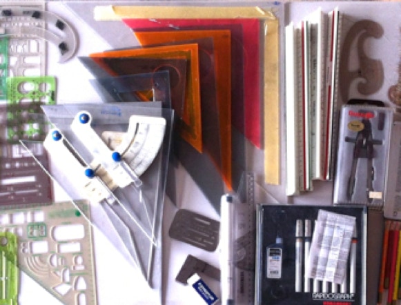Assorted templates, rulers, triangles, adjustable triangles, inking pen sets, compass, brushes, french curves, erasing shields, etc. (1 box available)